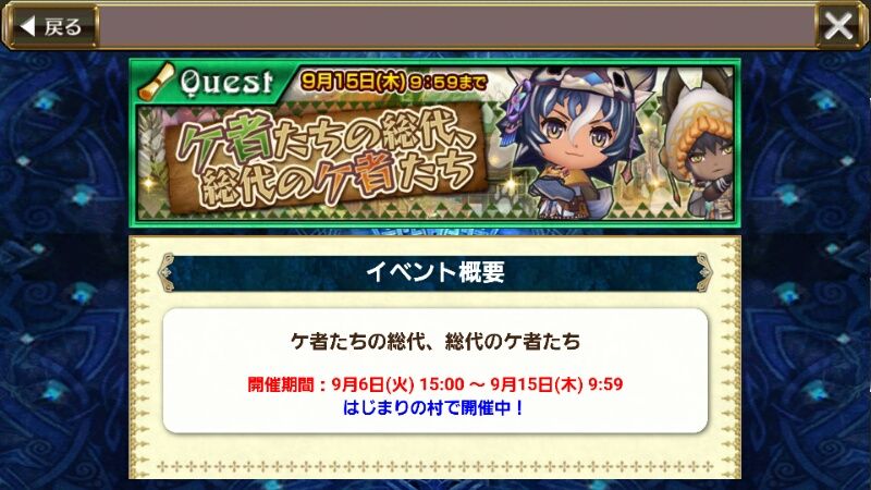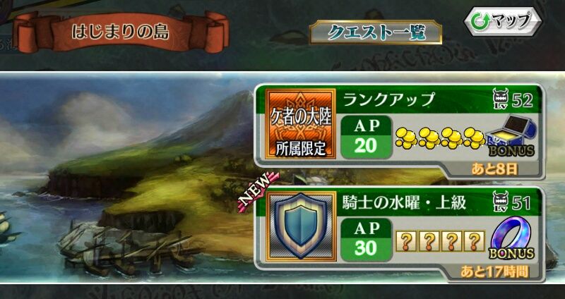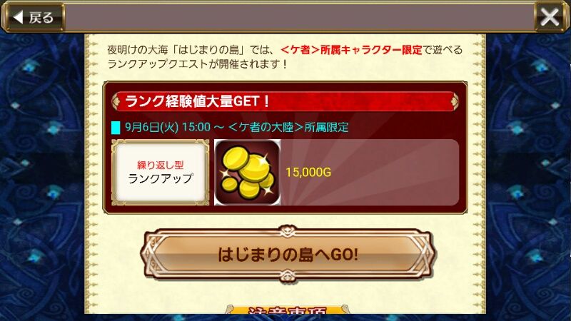 「はじまりの島」では、『ケ者』所属キャラクター限定で遊べるランクアップクエストが開催されますよ♪
