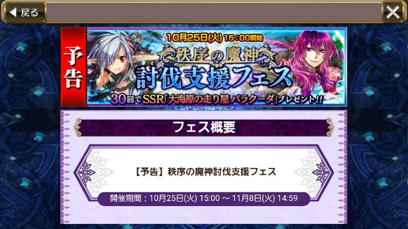 10/25から「秩序の魔神トゥキファト」討伐支援フェスが開催予定です☆